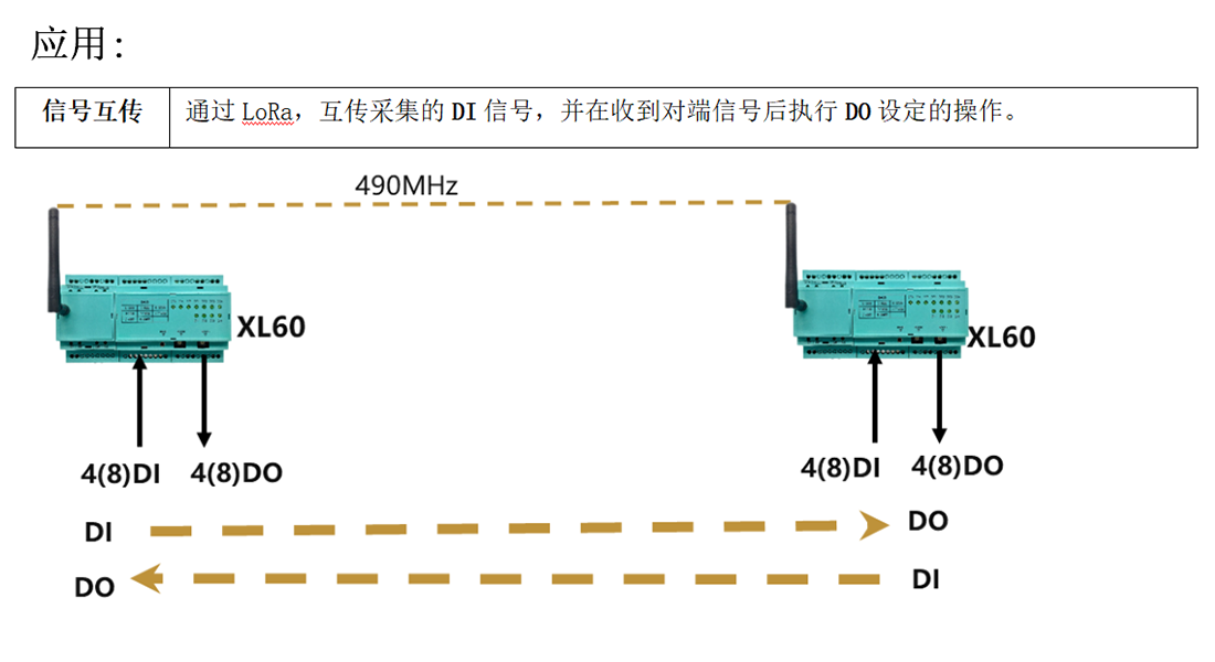 無(wú)線開(kāi)關(guān)量對(duì)傳模塊XL60D,由一對(duì)XL60D采集模塊組成,從一端模塊輸入的開(kāi)關(guān)信號(hào),無(wú)線對(duì)傳到另一端輸出開(kāi)關(guān)信號(hào)。開(kāi)關(guān)信號(hào)是一對(duì)一的輸入、輸出,DO隨著對(duì)應(yīng)DI的變化而變化。