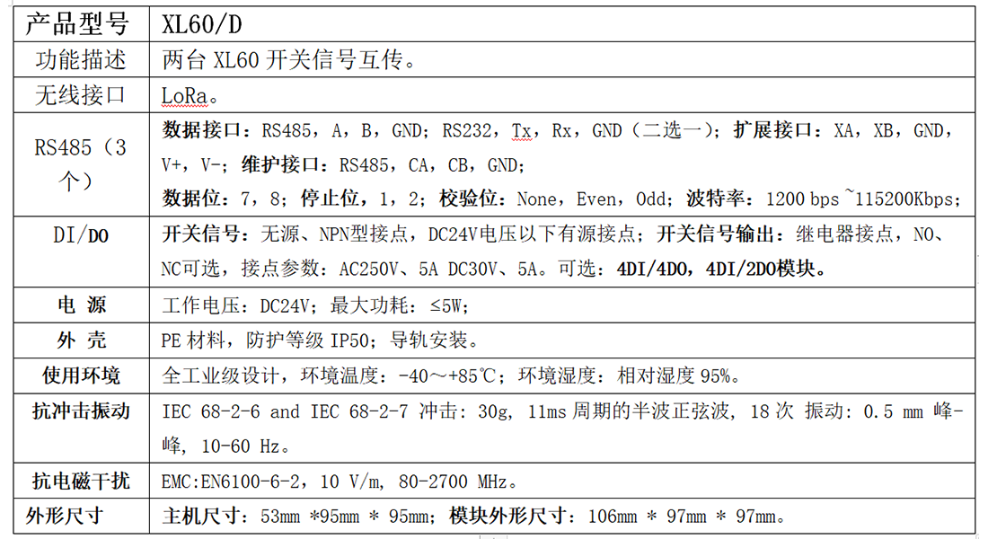 XL60D的通信方式是LoRa無(wú)線傳輸方式,每臺(tái)XL60D主機(jī)模塊,最多配兩個(gè)開(kāi)關(guān)量I/O模塊。