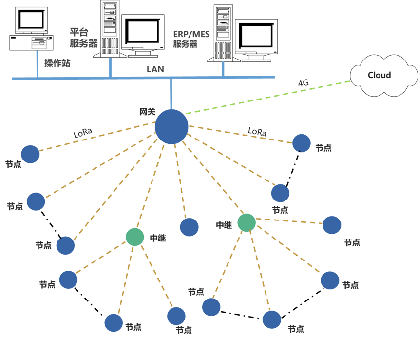 LoRa網(wǎng)絡(luò)是自定義通訊參數(shù)的LoRa通信網(wǎng)絡(luò);設(shè)計有中繼可延長無線傳輸距離。物聯(lián)網(wǎng)關(guān)對節(jié)點的數(shù)據(jù)進行通信協(xié)議轉(zhuǎn)換,可選多種通信接口、不同的通信協(xié)議,同時上傳數(shù)據(jù)至多個平臺服務(wù)器。