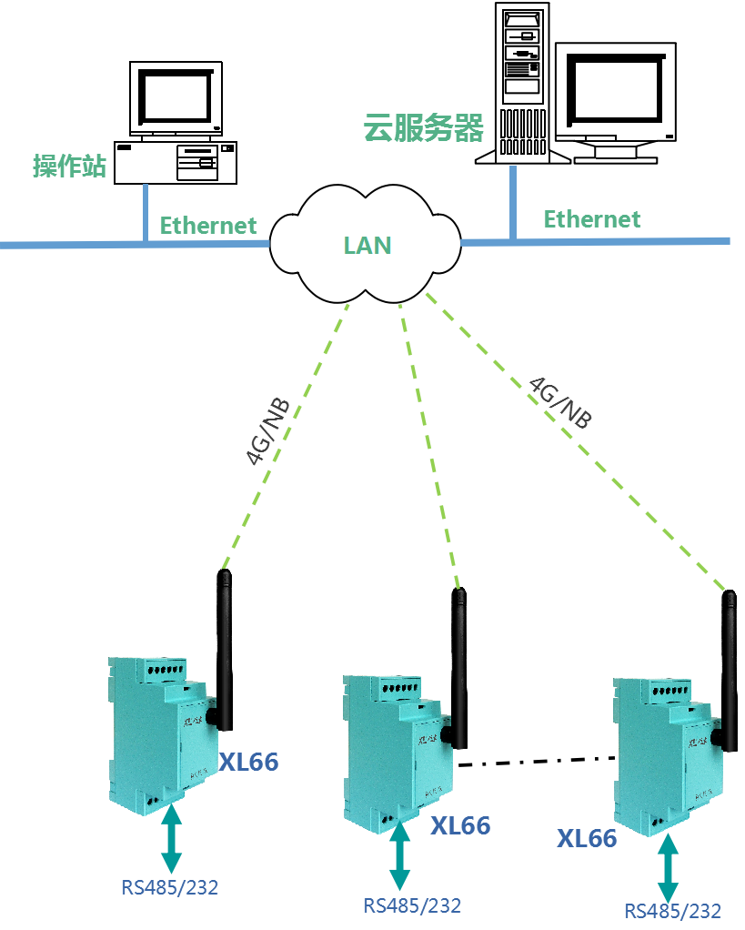 工廠、車間、園區(qū)等,有RS485或232通信接口的控制器、二次儀表、變送器等,通過XL66實現(xiàn)無線聯(lián)網(wǎng)。