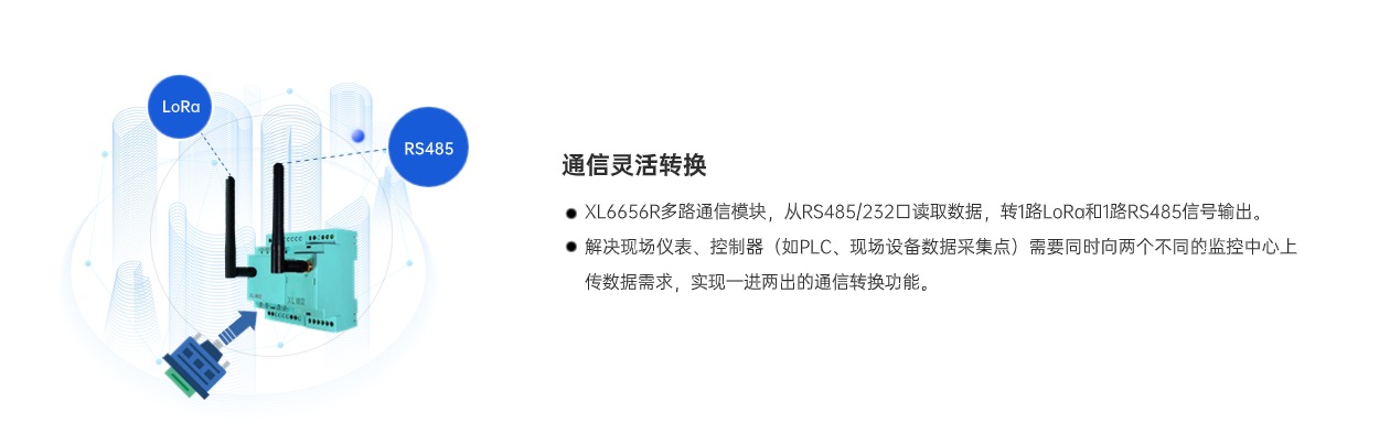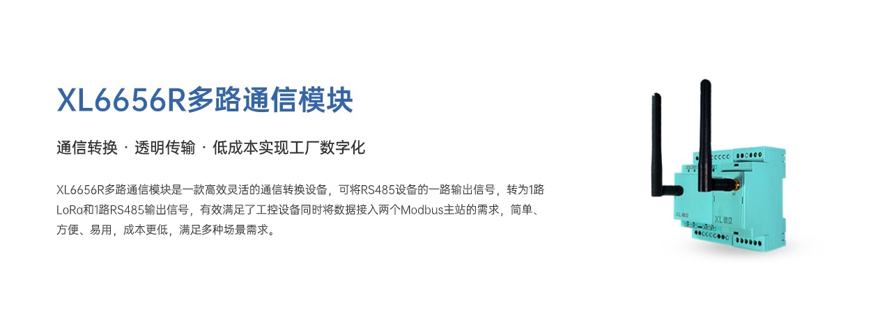 XL6656R多路通信模塊是一款高效靈活的通信轉(zhuǎn)換設備,可將RS485設備的一路輸出信號,轉(zhuǎn)為1路LoRa和1路RS485輸出信號,有效滿足了工控設備同時將數(shù)據(jù)接入兩個Modbus主站的需求,簡單、方便、易用,成本更低,滿足多種場景需求。