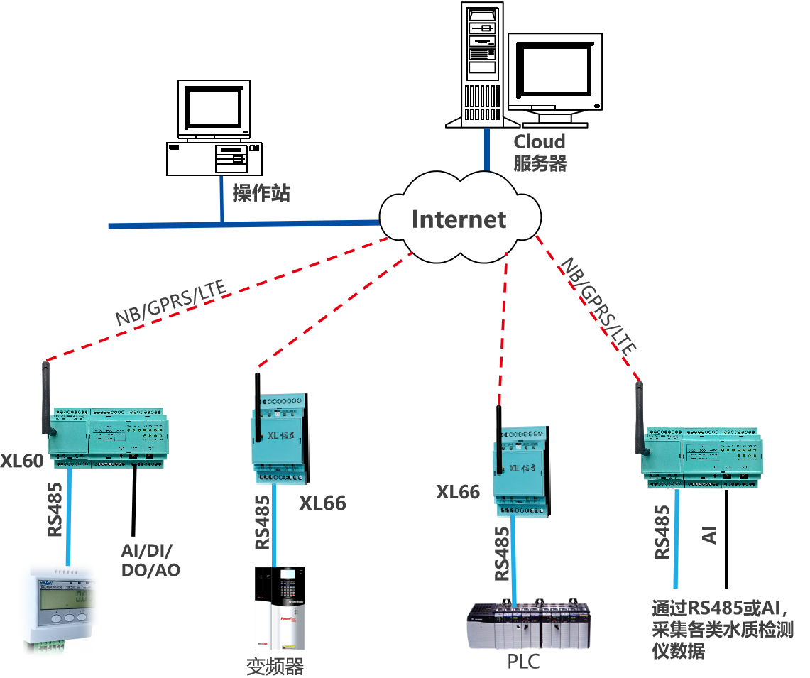 類似泵房、水廠、水源井等場所的數(shù)據(jù)監(jiān)測,監(jiān)測點的數(shù)據(jù)先上傳至XL90物聯(lián)網(wǎng)關(guān),再通過NB/GPRS/LTE轉(zhuǎn)發(fā)數(shù)據(jù)至云平臺,此種情況,數(shù)以后在量大時,可選LTE(4g)方式