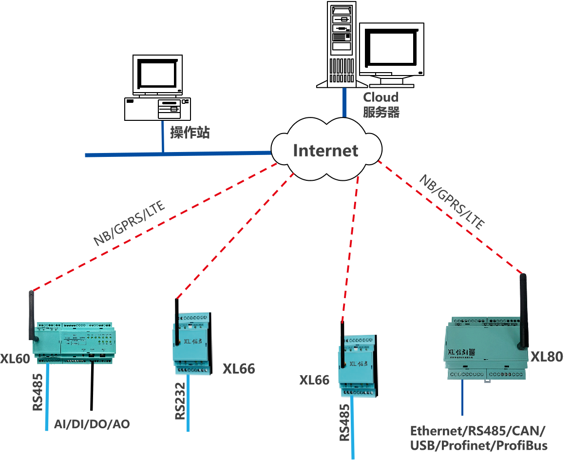 XL80智能主機(jī), Ethernet、CAN、USB、Profibus、 Profinet、RS485等接口,讀取數(shù)據(jù),NB/GPRS/LTE通信;推薦LTE