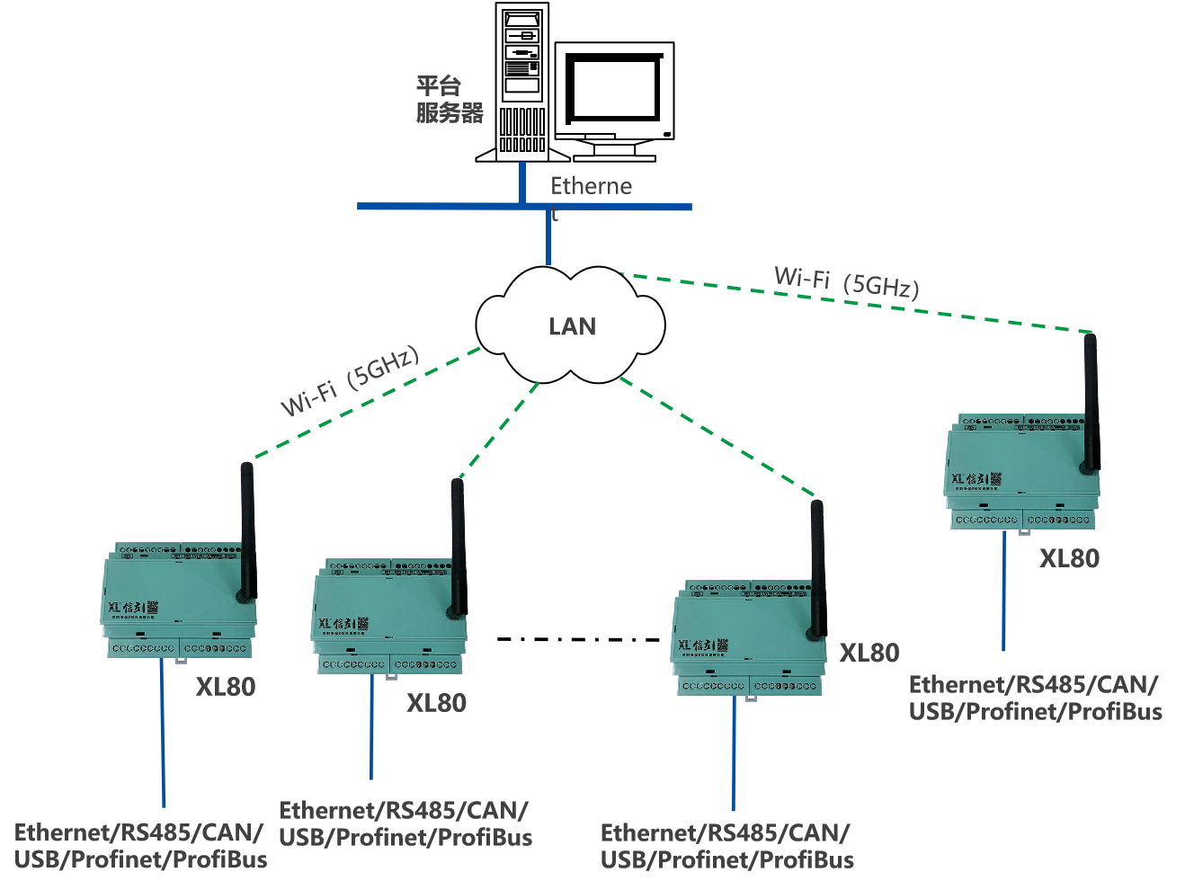 XL80智能主機(jī),通過Ethernet、CAN、USB、Profibus、 Profinet、RS485等接口,讀取數(shù)據(jù);支持Wi-Fi傳輸