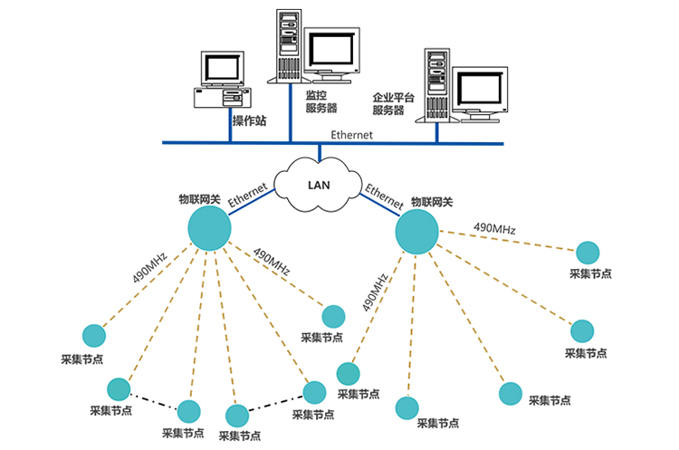 采集節(jié)點(diǎn)通過490MHz無(wú)線上傳數(shù)據(jù)至物聯(lián)網(wǎng)關(guān),網(wǎng)關(guān)通過Ethernet接入LAN,推送數(shù)據(jù)至企業(yè)管理平臺(tái)服務(wù)器;