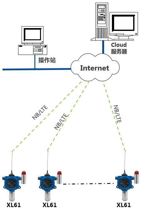 4、如增加現(xiàn)場集中監(jiān)控點(diǎn),可配置XL97網(wǎng)關(guān)終端,讀取區(qū)域內(nèi)XL61上傳的數(shù)據(jù),分析處理、顯示、報警,并轉(zhuǎn)發(fā)至監(jiān)控中心服務(wù)器。