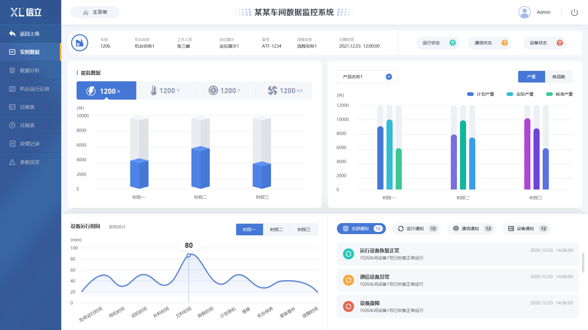 關聯(lián)機器運行狀態(tài)數(shù)據(jù)計算分析,判定機器運行時間有效性,生產計劃是否安排合理,機器操作是否規(guī)范,產品質量控制、產量是否達標。