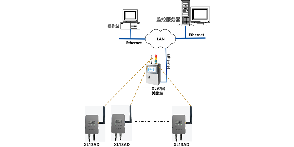 現(xiàn)場(chǎng)需要局部集中監(jiān)視時(shí),可配置XL97網(wǎng)關(guān)終端,讀取區(qū)域內(nèi)XL13AD上傳的數(shù)據(jù),分析處理、顯示、報(bào)警,并轉(zhuǎn)發(fā)至監(jiān)控中心服務(wù)器。