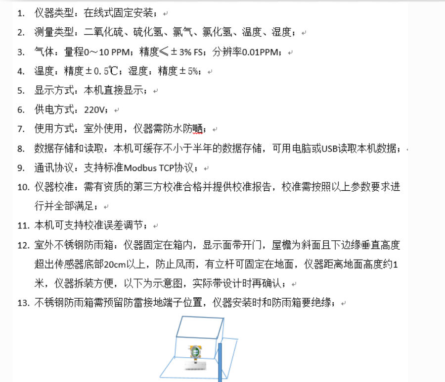 戶外箱體配置:建議選擇1套玻璃鋼百葉箱,安裝XL68環(huán)境監(jiān)測終端及傳感器探頭。建議選擇尺寸足夠的標(biāo)準(zhǔn)產(chǎn)品。