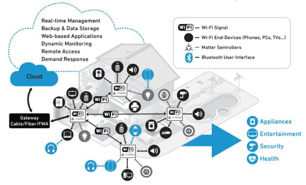 Matter有助于消費(fèi)類(lèi)物聯(lián)網(wǎng)互聯(lián)生態(tài)系統(tǒng)輕松實(shí)現(xiàn)即插即用,從而簡(jiǎn)化智能家居和智能辦公環(huán)境。它在互聯(lián)網(wǎng)協(xié)議之上提供一個(gè)層,其中包括一組適用于所有Matter連接設(shè)備的預(yù)定義方案。這使得 Matter 設(shè)備能夠了解它們正在與什么類(lèi)型的對(duì)象進(jìn)行通信,以及這些對(duì)象有什么樣的功能。Matter 使物聯(lián)網(wǎng)終端設(shè)備或節(jié)點(diǎn)能夠與各種 Wi-Fi 網(wǎng)絡(luò) pod 輕松通信。