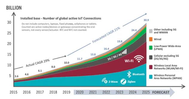 圖2:使用不同技術(shù)的物聯(lián)網(wǎng)設(shè)備的實際和預(yù)測數(shù)量