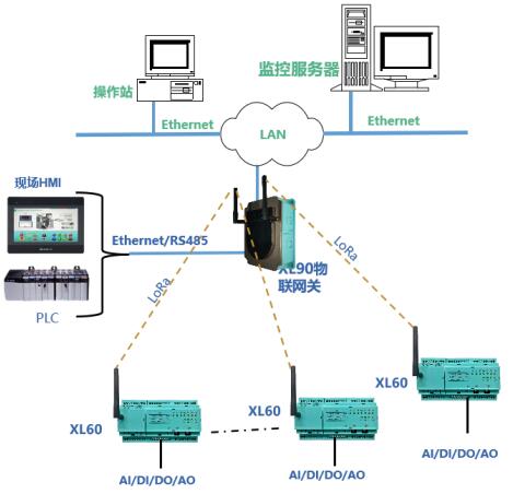 方案一:XL60無線采集裝置采集的現(xiàn)場(chǎng)設(shè)備數(shù)據(jù),采用LoRa無線傳輸方式,傳輸至XL90物聯(lián)網(wǎng)關(guān),經(jīng)協(xié)議轉(zhuǎn)換后將數(shù)據(jù)通過Ethernet或RS485上傳至監(jiān)控平臺(tái)、PLC、觸摸屏、控制器等設(shè)備。