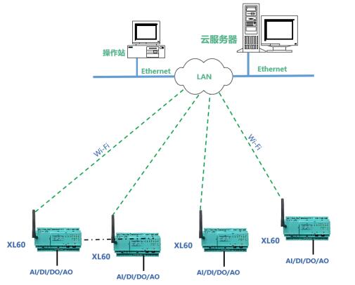 方案二:對(duì)于覆蓋Wi-Fi的區(qū)域,XL60無線采集裝置可直接通過Wi-Fi接入局域網(wǎng),通過LAN直接推送數(shù)據(jù)至監(jiān)控服務(wù)器。