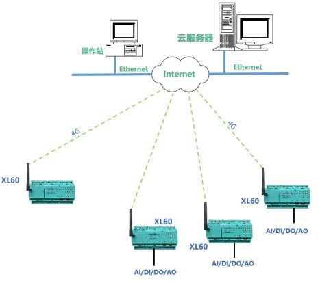 方案三:對(duì)于位置偏遠(yuǎn)或安裝分散的設(shè)備運(yùn)行參數(shù),如管網(wǎng)、管溝的壓力、溫度、液位、流量、氣體濃度等信號(hào),XL60無線采集裝置可采用4G通信將采集的數(shù)據(jù)直接上傳至云平臺(tái)。
