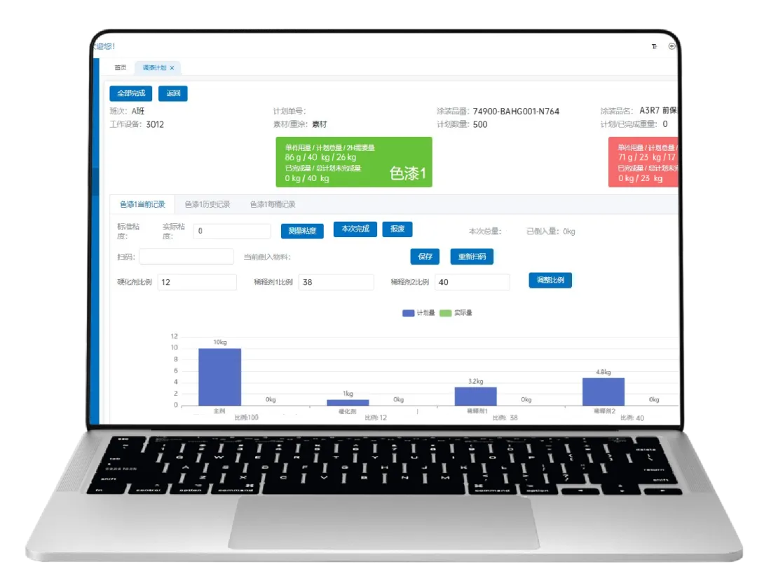 當(dāng)某種原料倒入過多,系統(tǒng)彈窗報(bào)警,經(jīng)上級權(quán)限確認(rèn)后系統(tǒng)根據(jù)給定配比,自動(dòng)更新各原料所需重量。整個(gè)調(diào)漆過程,操作員只需遵循系統(tǒng)操作流程倒入原料,大大降低調(diào)漆人員準(zhǔn)入門檻,打破傳統(tǒng)依賴經(jīng)驗(yàn)的調(diào)漆模式。