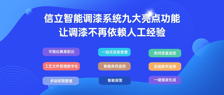 信立智能調(diào)漆系統(tǒng)XPMS,九大亮點(diǎn)功能設(shè)計(jì),逐一解決調(diào)漆過程固有問題,降低對人的依賴,減少漆料浪費(fèi),更準(zhǔn)確完整地計(jì)算統(tǒng)計(jì)漆料的使用及產(chǎn)出。
