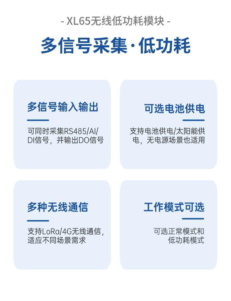 XL65無線低功耗模塊,集成RS485通信口和豐富的I/0口,可實(shí)現(xiàn)同時(shí)采集1路AI信號(hào)、3路DI信號(hào)、1路RS485信號(hào),支持多種無線通信方式上傳采集的信號(hào)和數(shù)據(jù)。可選電池供電,適用于更多供電不便的場景。